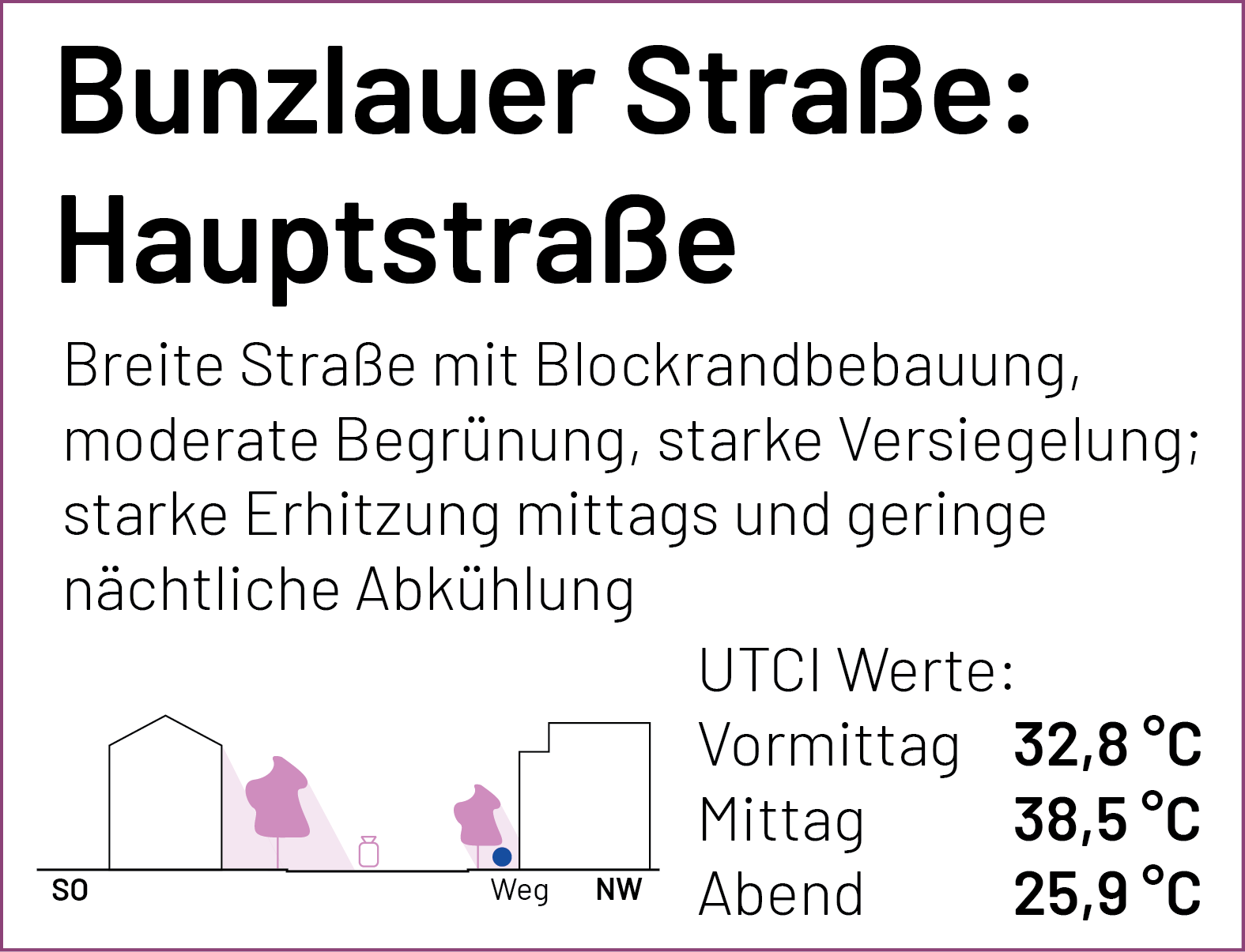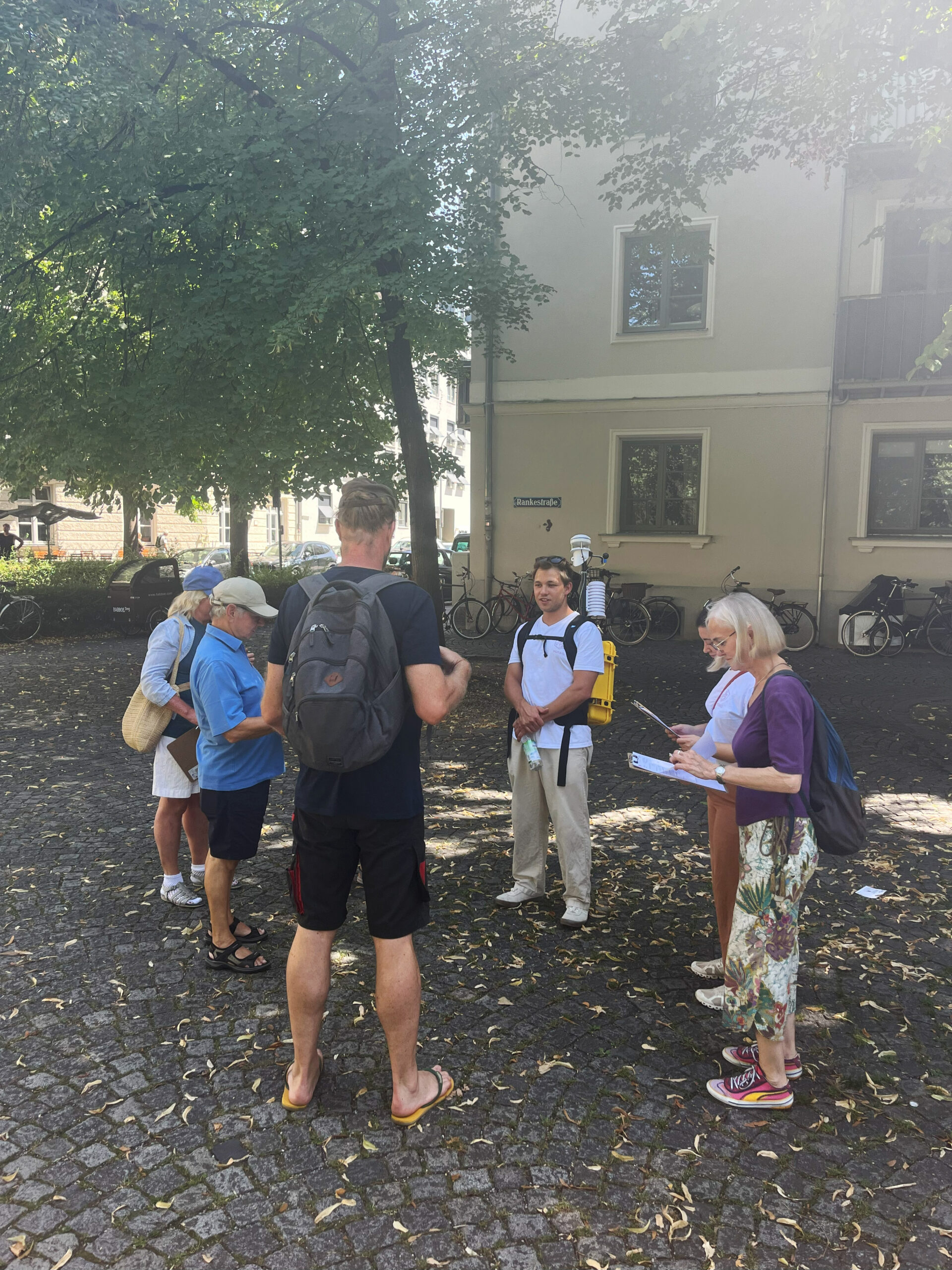 Die Klima-Spaziergänge fanden im August 2025 statt – während einer Hitzewelle mit sehr warmen Tagen und teils tropischen Nächten. Am frühen Nachmittag (14 Uhr) untersuchten Anwohnende untersuchten gemeinsam mit Climateflux das lokale Stadtklima in beiden Quartieren. Am frühen Nachmittag lassen sich meist die höchsten Temperaturen messen. Dafür wurden Messungen mit einer tragbaren Wetterstation durchgeführt. Gemessen wurden u. a. Lufttemperatur, Luftfeuchtigkeit, solare Strahlung und Windgeschwindigkeit. Aus den Messwerten lässt sich der UTCI-Wert (Universal Thermal Climate Index) in Grad Celsius (°C) berechnen. Der UTCI gibt als äquivalente Temperatur an, wie der menschliche Körper thermische Bedingungen empfindet. Außerdem dokumentierten Befragungen die Auswirkungen der spezifischen klimatischen Bedingungen auf die Teilnehmenden. Um den Tagesverlauf der thermischen Belastung zu verstehen, fanden Messungen zu zwei weiteren Tageszeiten statt: Am Vormittag (10 Uhr) und am Abend (22 Uhr). Vormittags heizt sich die Stadt auf. Am Abend wird sichtbar, wie stark und wo sich die Stadt wieder abkühlt.