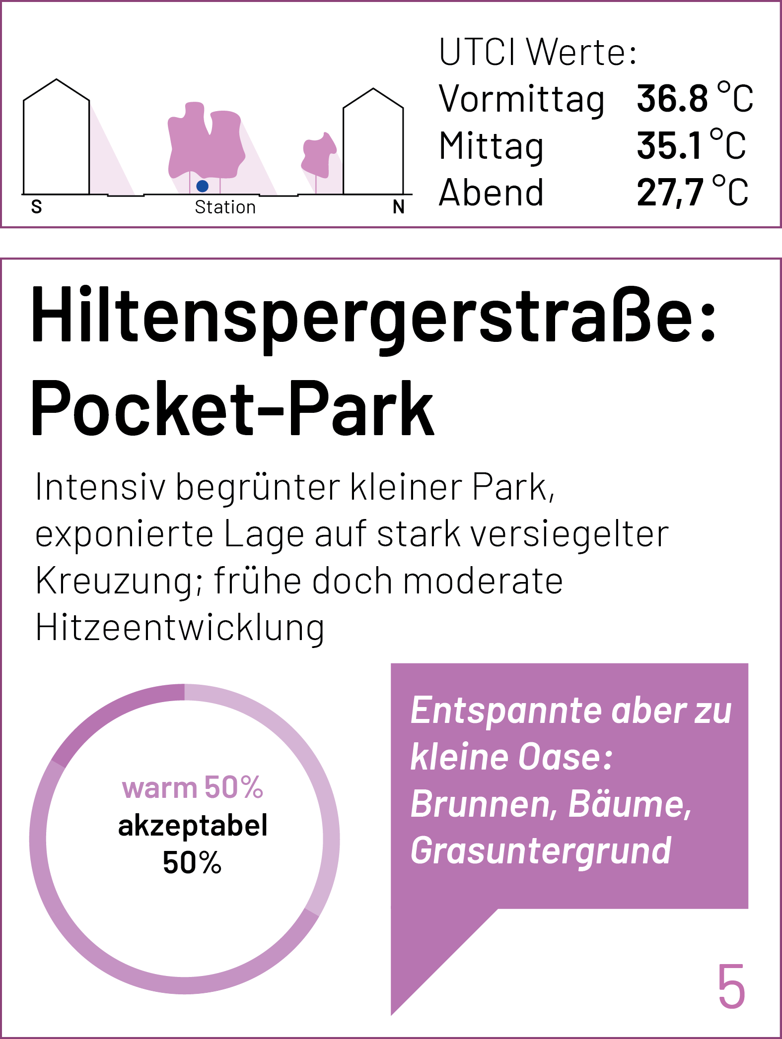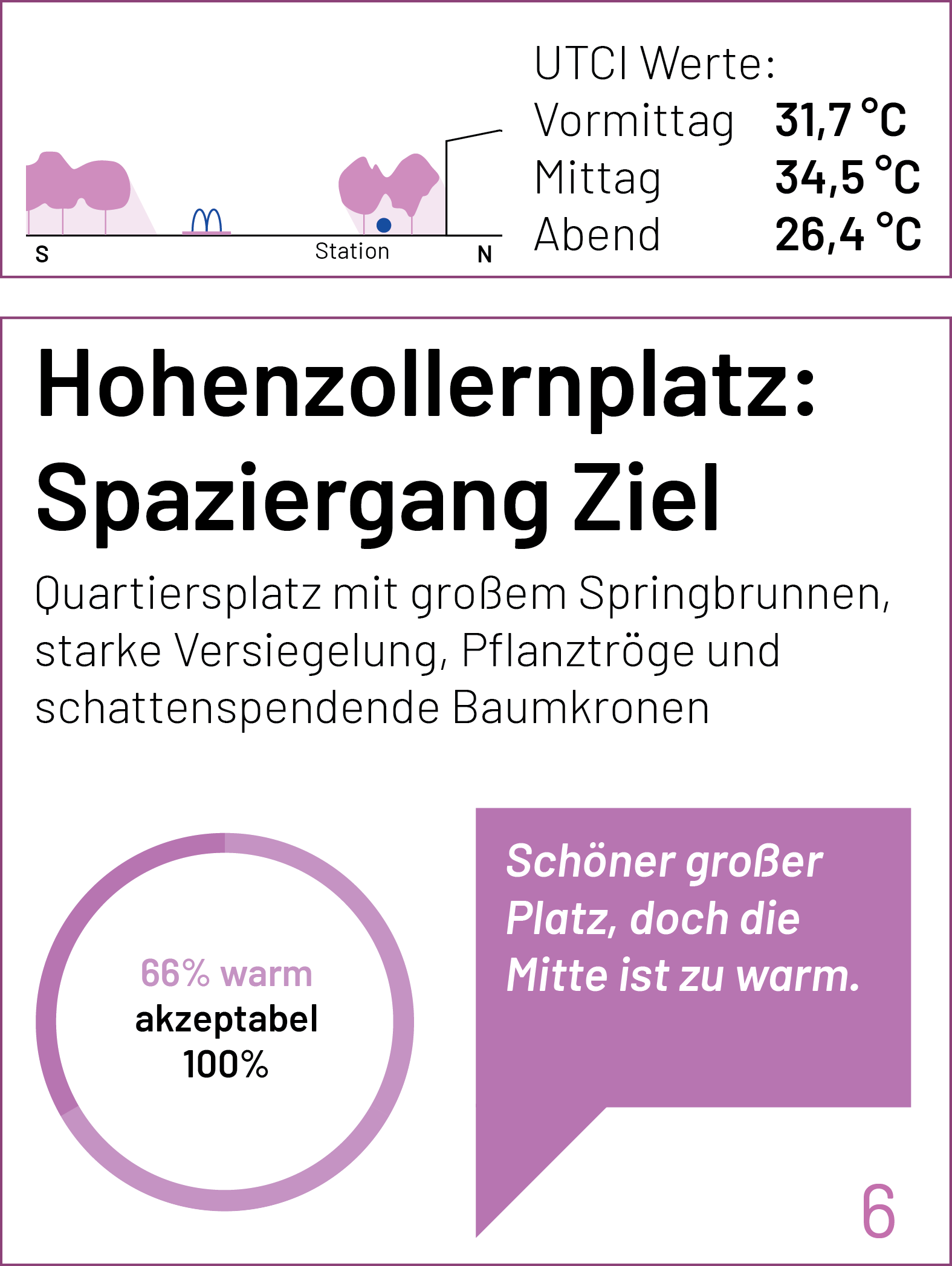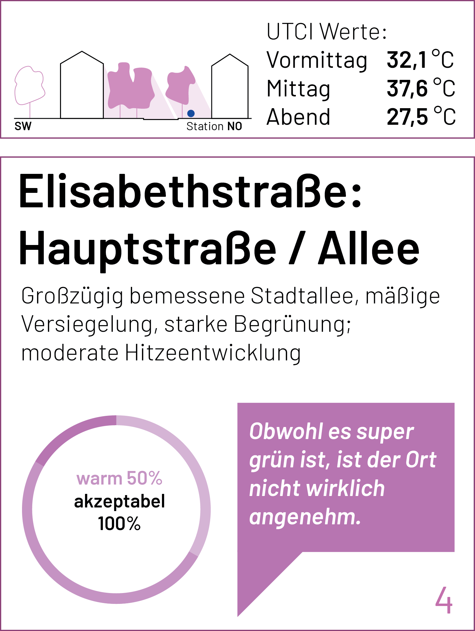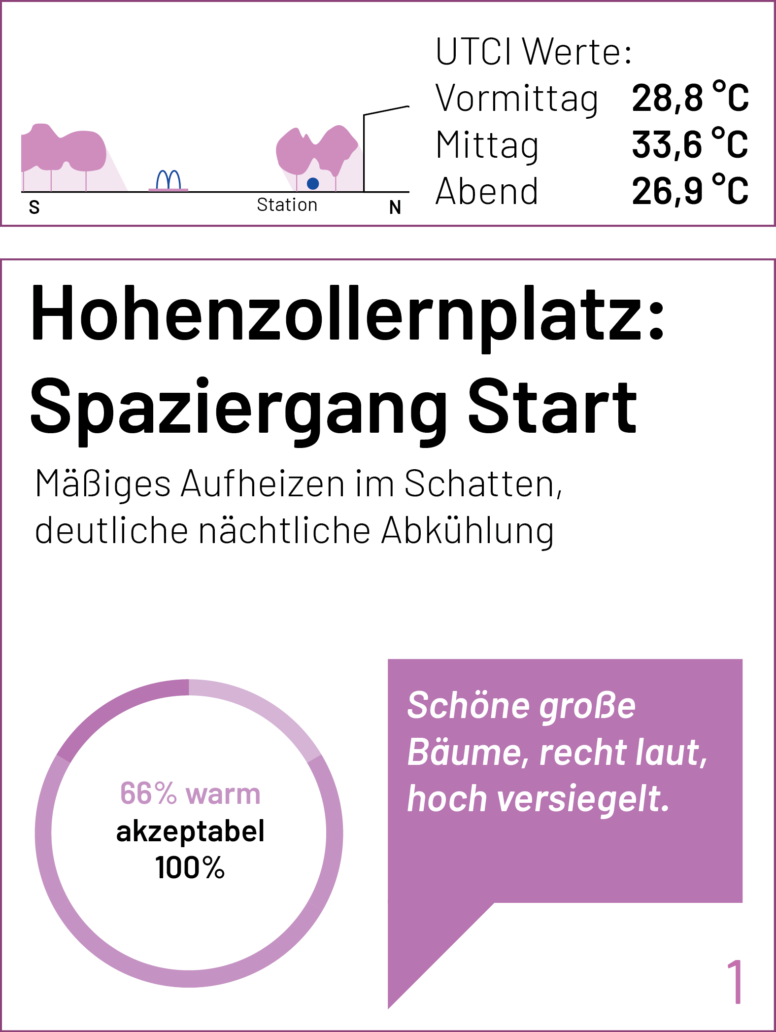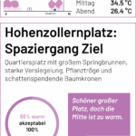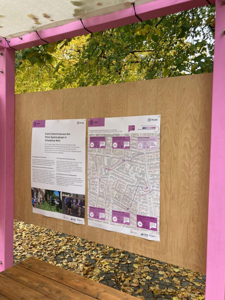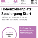Auf der Karte sind die einzelnen Stationen der Spaziergänge und Messungen markiert. Zu jedem Punkt lassen sich der gemessene UTCI-Wert (zu drei Tageszeiten) und kurze Einschätzungen der Teilnehmenden zum thermischen Komfort (am frühen Nachmittag) anzeigen. Einen ausführlichen Bericht zum Hintergrund des Forschungsformats und den Messungen findet Ihr bald hier.