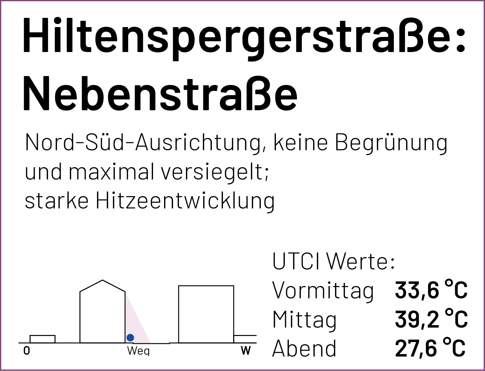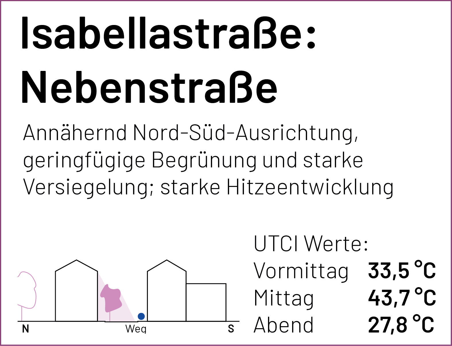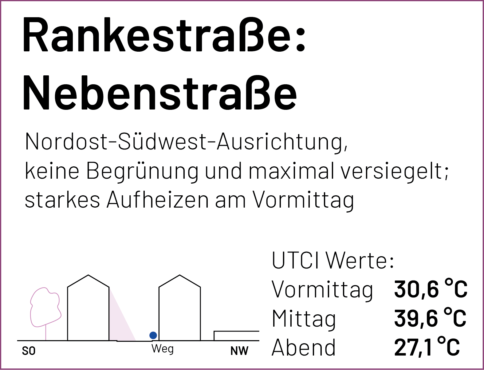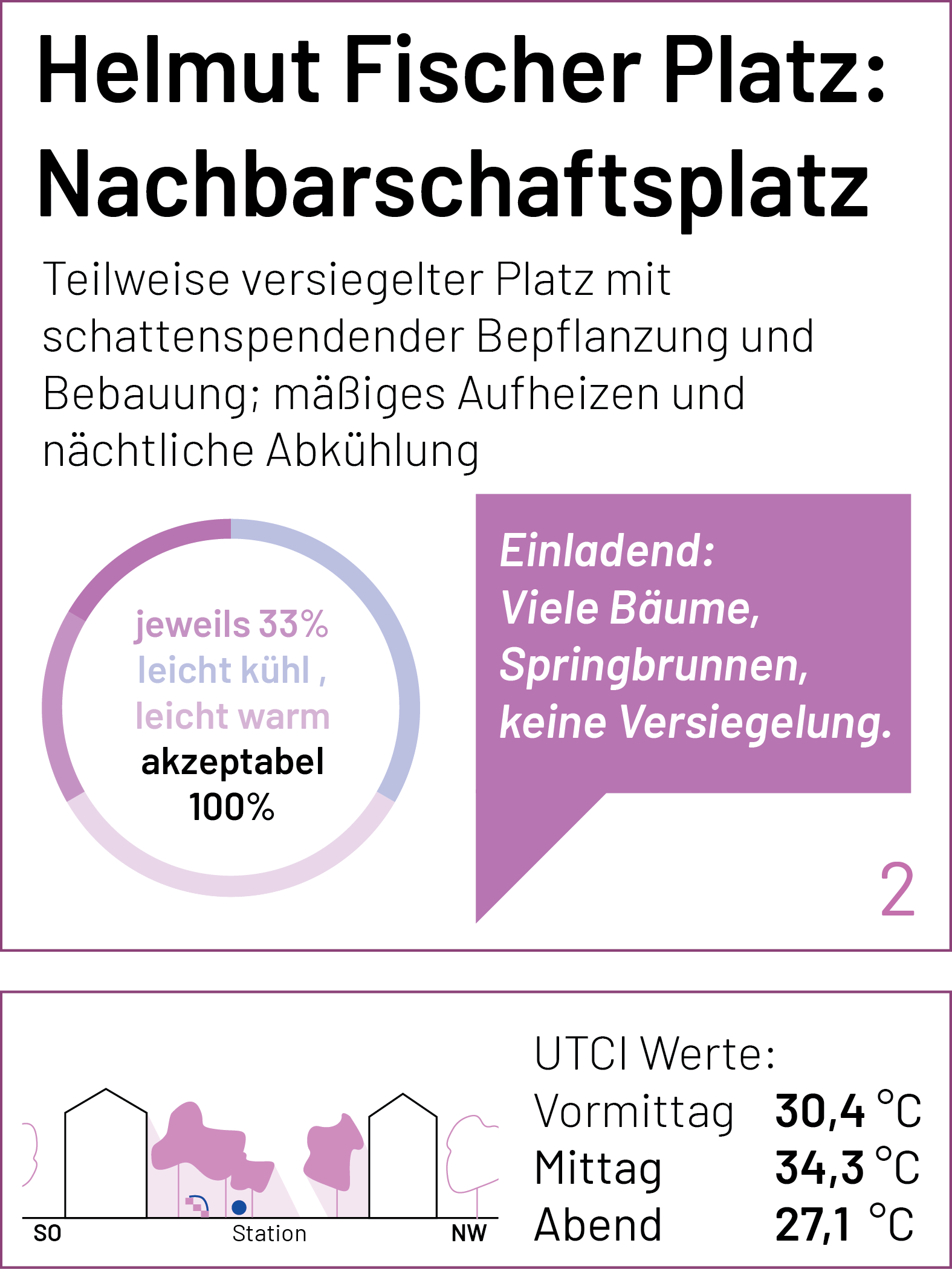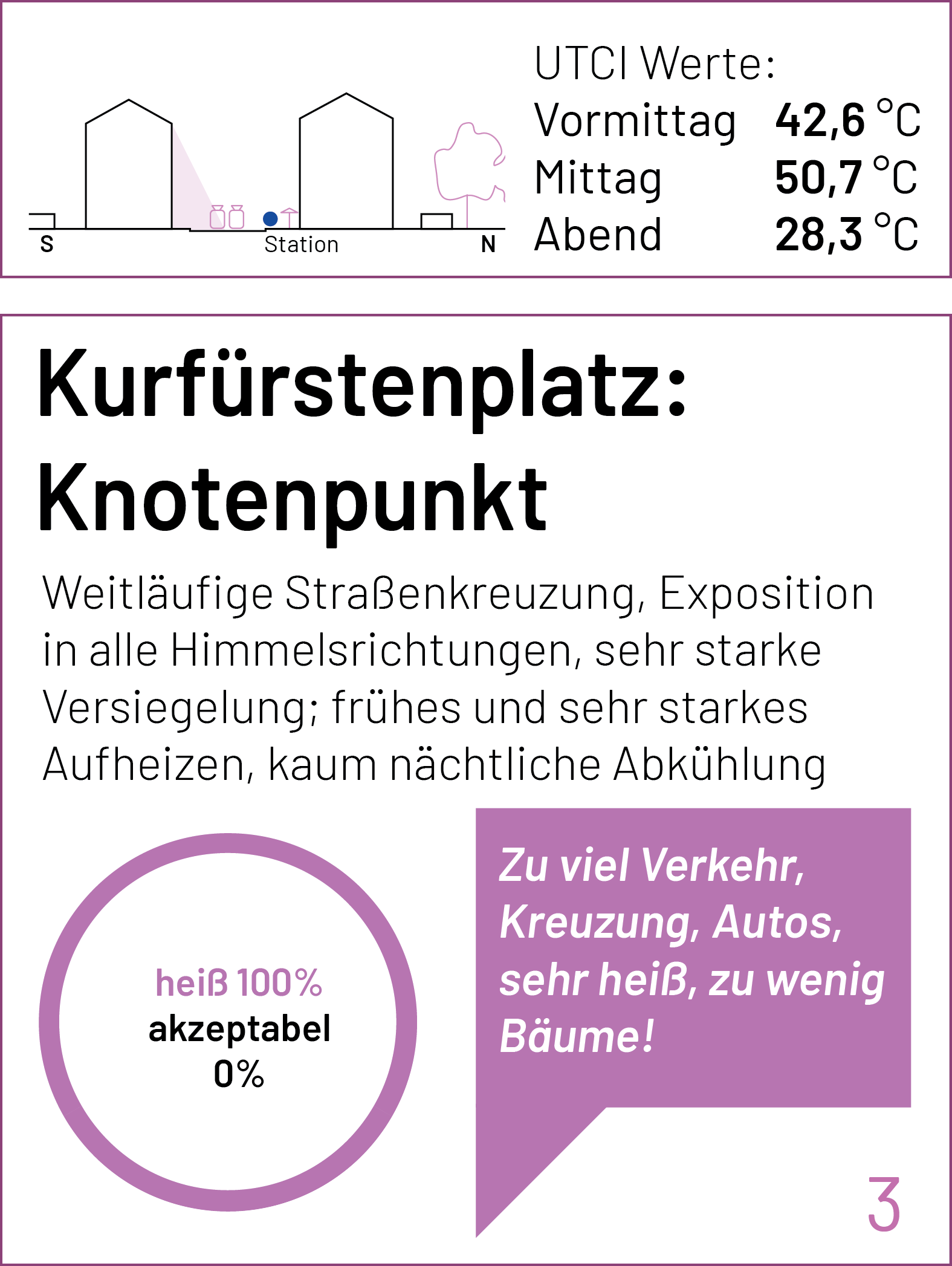Auf der Karte sind die einzelnen Stationen der Spaziergänge und Messungen markiert. Zu jedem Punkt lassen sich der gemessene UTCI-Wert (zu drei Tageszeiten) und kurze Einschätzungen der Teilnehmenden zum thermischen Komfort (am frühen Nachmittag) anzeigen. Einen ausführlichen Bericht zum Hintergrund des Forschungsformats und den Messungen findet Ihr bald hier.